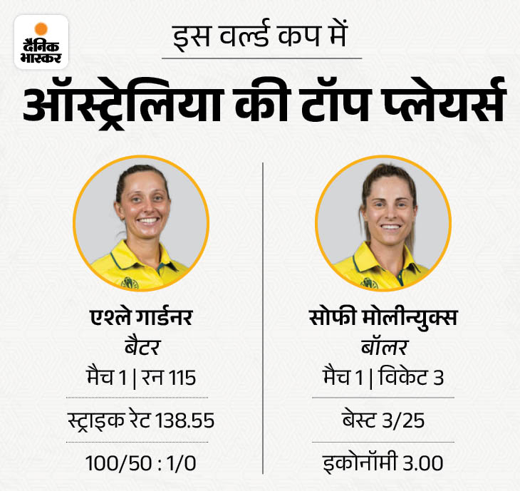 गार्डनर ने पिछले मैच में शतक लगाया था ऑस्ट्रेलिया की ओर से एश्ले गार्डनर ने पहले मैच में शतक लगाया। वहीं सोफी मोलीन्युक्स ने तीन विकेट लिए। न्यूजीलैंड के खिलाफ पहले मुकाबले में टीम के 5 विकेट 150 रन के अंदर गिर गए थे। ऑस्ट्रेलिया ने यहां से कमबैक किया और 300 प्लस रन बना दिए।