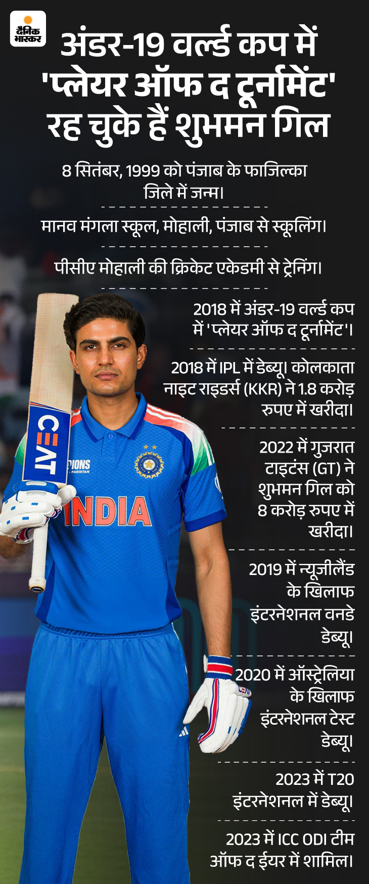 साल 2018 में न्यूजीलैंड में टीम इंडिया अंडर-19 वर्ल्ड चैंपियन बनीं। उस टीम के कोच दिग्गज राहुल द्रविड़ थे, कप्तानी पृथ्वी शॉ ने की थी, और टीम के उप-कप्तान थे शुभमन गिल। वर्ल्डकप के 6 मौचों में शुभमन ने 372 रन बनाए थे और भारत को चैंपियन बनाने में महत्वपूर्ण भूमिका निभाई थी। हालांकि, ऑस्ट्रेलिया के खिलाफ फाइनल मैच में मनजोत कालरा ने 101 रनों की पारी खेली थी और मैन ऑफ द मैच रहे थे।