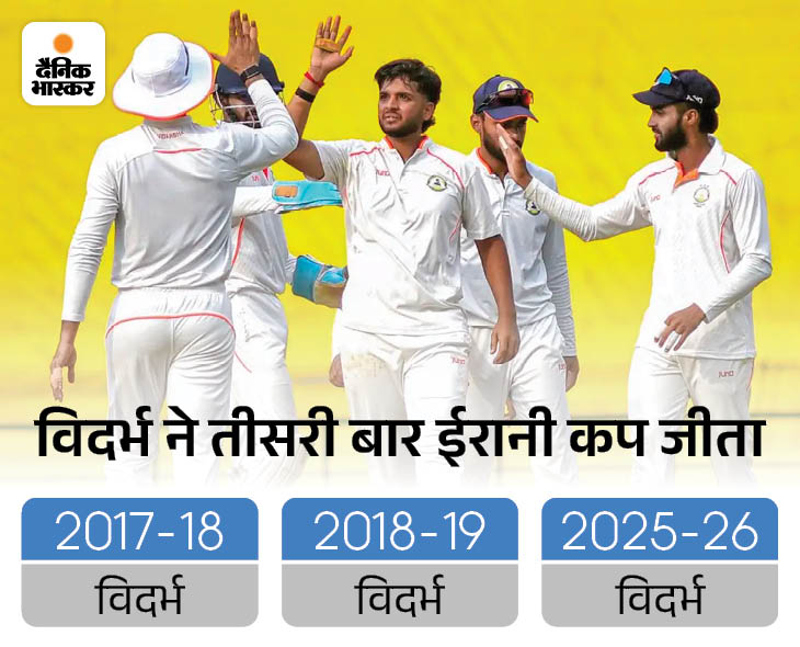 विदर्भ ने तीसरी बार ईरानी कप जीत लिया। टीम ने रविवार को रेस्ट ऑफ इंडिया को 93 रन से हरा दिया। नागपुर क्रिकेट स्टेडियम रेस्ट ऑफ इंडिया की दूसरी पारी 267 रन पर सिमट गई। टीम से यश धुल ने सबसे ज्यादा 92 रन बनाए। विदर्भ से हर्ष दुबे ने 4 विकेट चटकाए।