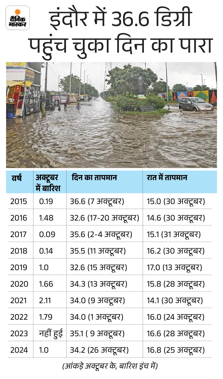 इंदौर में 22 अक्टूबर 2000 को दिन का तापमान 37.8 डिग्री तक पहुंच गया था। यह अब तक का रिकॉर्ड है। 25 साल पहले 22 अक्टूबर 1999 को रात का तापमान 6.2 डिग्री सेल्सियस दर्ज किया गया था। यह अब तक की सबसे ठंडी रात रही थी। वर्ष 1985 में अक्टूबर महीने में 9 इंच से ज्यादा बारिश हो गई थी। 24 घंटे में सबसे ज्यादा बारिश 9 अक्टूबर 1985 को 6.19 इंच हुई थी।