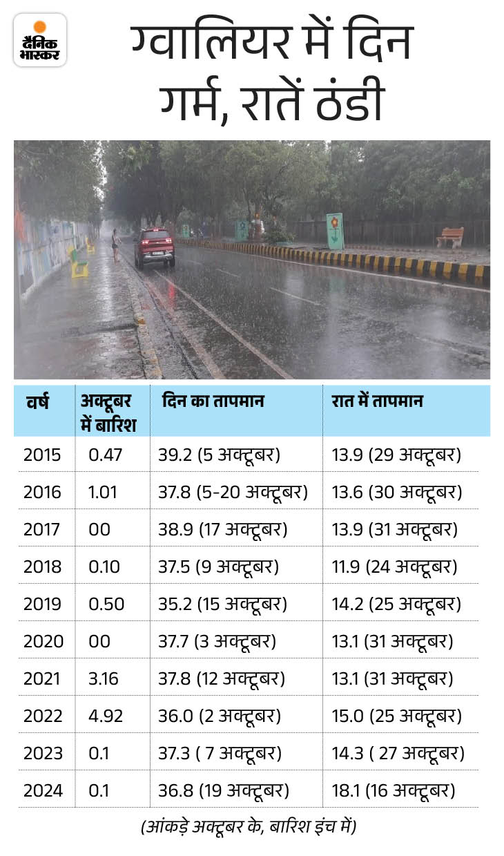 वहीं, न्यूनतम तापमान 11.7 डिग्री 12 अक्टूबर 2012 को रहा था। इस महीने बारिश का भी ट्रेंड है। साल 1955 में पूरे महीने साढ़े 7 इंच बारिश हुई थी। 6 अक्टूबर 2009 को 24 घंटे में रिकॉर्ड 5 इंच पानी गिरा था।
