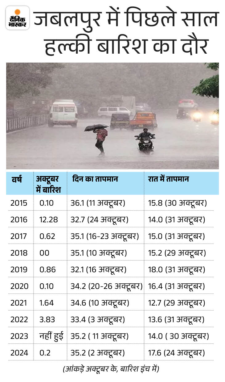 जबलपुर: 73 साल पहले सबसे सर्द रही थी रात जबलपुर में अक्टूबर महीने में औसत अधिकतम तापमान 31.8 और औसत न्यूनतम तापमान 20.3 डिग्री सेल्सियस रहता है। हालांकि, पिछले 10 साल में दिन-रात का पारा इससे अधिक ही रहा। 11 अक्टूबर 2015 को तापमान 36.1 डिग्री रहा था जबकि पिछले 2 साल से रात में तापमान 14 से 17.6 डिग्री सेल्सियस तक पहुंच गया है।
