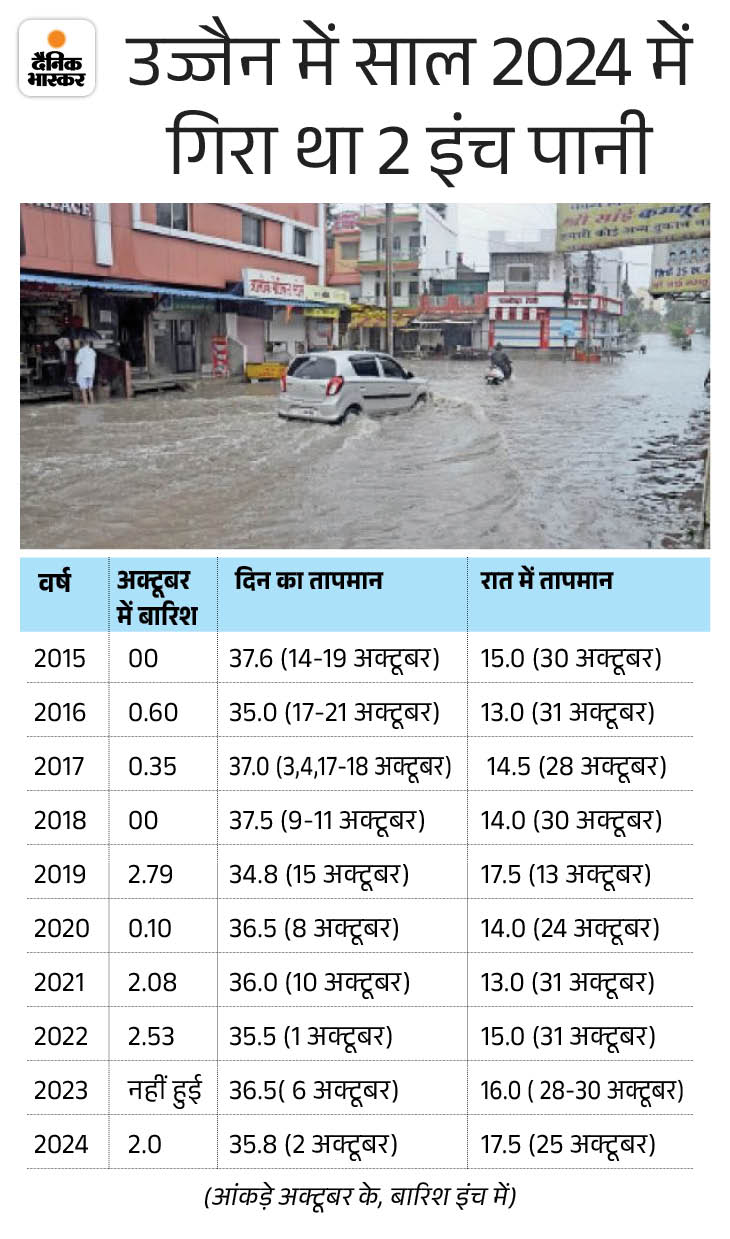 उज्जैन: 10 में से 3 साल बारिश नहीं हुई उज्जैन में पिछले 10 में से 3 साल अक्टूबर महीने में बारिश नहीं हुई। वर्ष 2009 में सर्वाधिक मासिक बारिश 4.46 इंच हुई थी। 24 घंटे में सबसे ज्यादा 5 अक्टूबर 2009 को हुई थी। इस दिन 92 मिमी यानी 3.62 इंच बारिश हो गई थी।