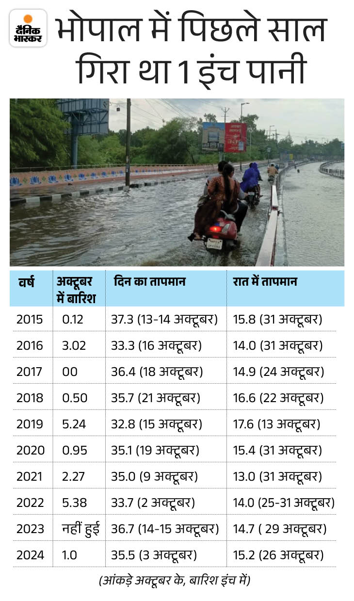 भोपाल: 2012 में रिकॉर्ड 38 डिग्री रहा था तापमान भोपाल में अक्टूबर का सामान्य औसत अधिकतम तापमान 32.7 और न्यूनतम तापमान 19.1 डिग्री सेल्सियस रहा है। पिछले 10 साल में तापमान 33 डिग्री के पार ही रहा। 2015 में यह 37.3 डिग्री तक पहुंच चुका है। 2012 में पारा रिकॉर्ड 38 डिग्री सेल्सियस तक पहुंच गया था।