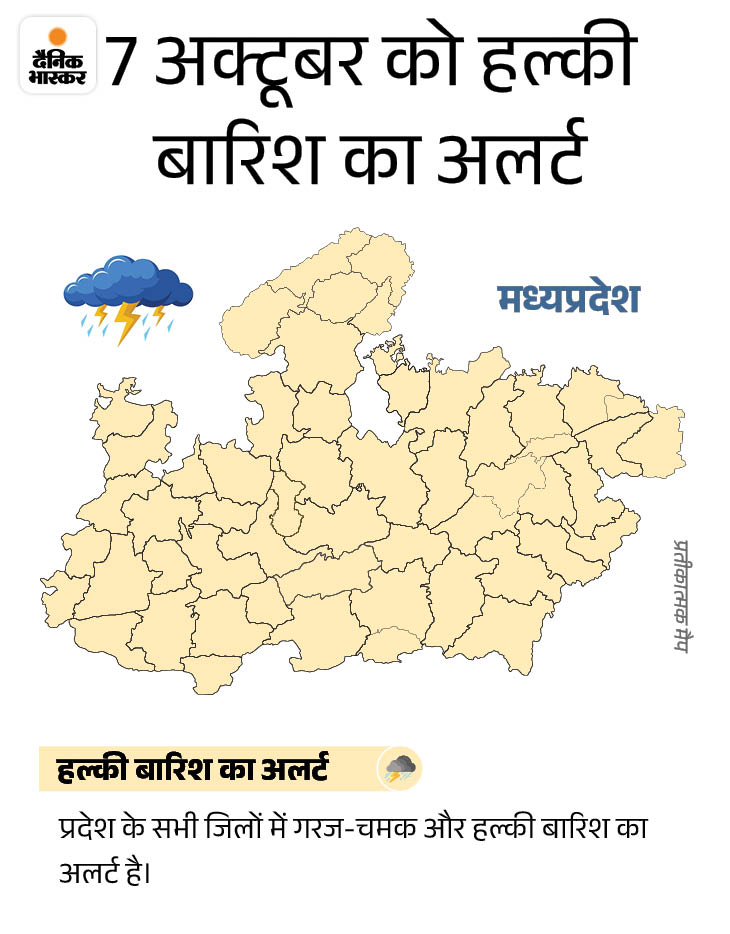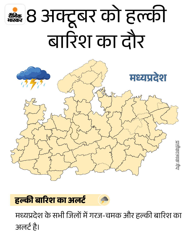 मौसम वैज्ञानिक अरुण शर्मा ने बताया कि अगले 3 दिन में हल्की बारिश का दौर रहेगा। वहीं, ग्वालियर-चंबल संभाग ड्राई रहेगा। फिलहाल कहीं भी भारी बारिश का अलर्ट नहीं है।
