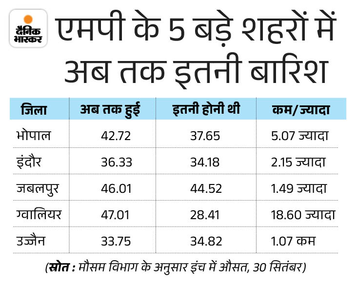 बता दें कि इस साल मानसून ने मध्यप्रदेश में 16 जून को दस्तक दी थी। समय से एक दिन बाद मानसून प्रदेश में एंटर हुआ था। मौसम विभाग के अनुसार, 6 अक्टूबर तक प्रदेश के सभी जिलों से मानसून विदा हो जाता है, लेकिन नया सिस्टम बनने से विदाई की तारीख आगे भी बढ़ सकती है।