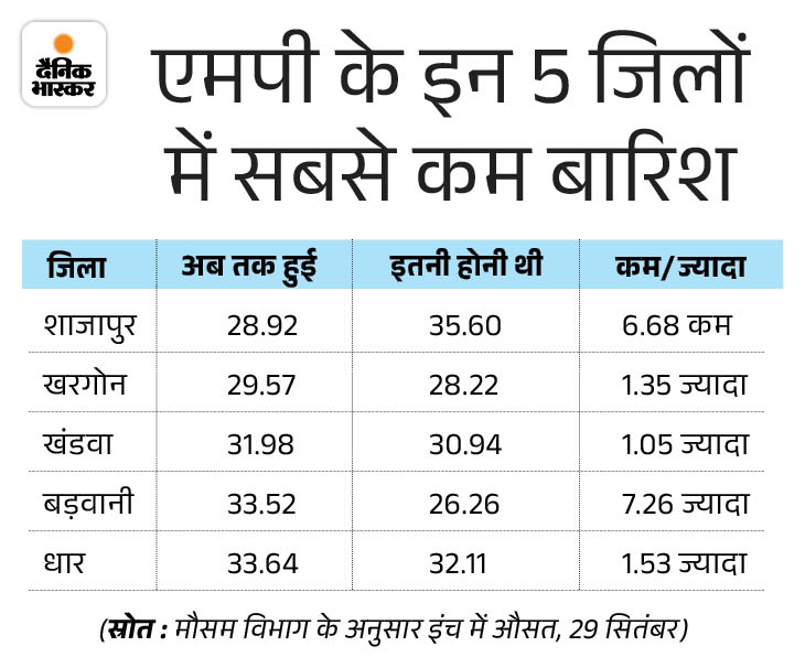 गुना में सबसे ज्यादा बारिश इस बार गुना में सबसे ज्यादा पानी गिरा है। 65.6 इंच बारिश दर्ज हुई। मंडला-रायसेन में 62 इंच से अधिक और श्योपुर-अशोकनगर में 56 इंच से ज्यादा बारिश हो चुकी है। वहीं, शाजापुर, खरगोन, खंडवा, बड़वानी और धार सबसे कम बारिश वाले टॉप-5 जिलों में शामिल हैं। शाजापुर में 28.9 इंच, खरगोन में 29.6 इंच, खंडवा में 32 इंच, बड़वानी में 33.5 इंच और धार में 33.6 इंच पानी गिरा है।