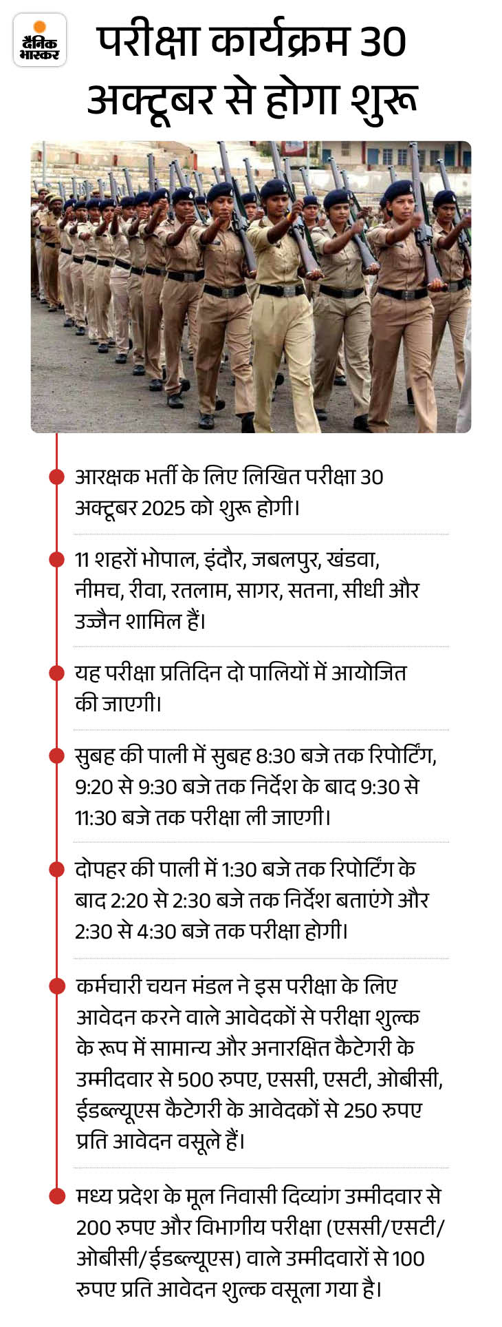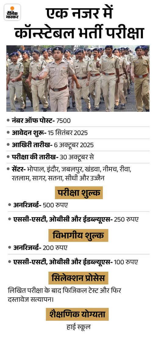 मध्य प्रदेश कर्मचारी चयन बोर्ड (ईएसबी) द्वारा पुलिस विभाग में 7,500 कांस्टेबलों की सीधी भर्ती के लिए जमा कराए जा रहे ऑनलाइन आवेदन की प्रक्रिया सोमवार को पूरी हो गई है। 15 सितंबर 2025 से शुरू हुए ऑनलाइन आवेदन जमा कराने का काम पहले 29 सितम्बर तक चला और इसके बाद इसे एक हफ्ते तक यानी 6 अक्टूबर तक के लिए आगे बढ़ा दिया गया। भर्ती परीक्षा 30 अक्टूबर 2025 से शुरू होगी।