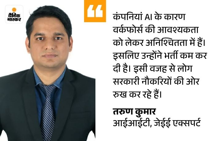 एक्सपर्ट बोले- प्राइवेट सेक्टर में भी अच्छे जॉब्स नहीं मिल रहे आईआईटी जेईई एक्सपर्ट तरुण कुमार ने बताया कि अभी जो लोग PHD कर रहे हैं, उन्हें प्राइवेट सेक्टर में भी अच्छे जॉब्स नहीं मिल पा रहे हैं। इसलिए हायर एजुकेटेड लोग दूसरे विकल्प तलाश रहे हैं। सरकारी नौकरी में सैलरी भले कम होती है, लेकिन यह हमें जॉब की सिक्योरिटी देती है। यही सबसे बड़ी वजह है कि हायर एजुकेटेड लोग सरकारी नौकरी की तरफ आकर्षित हो रहे हैं।