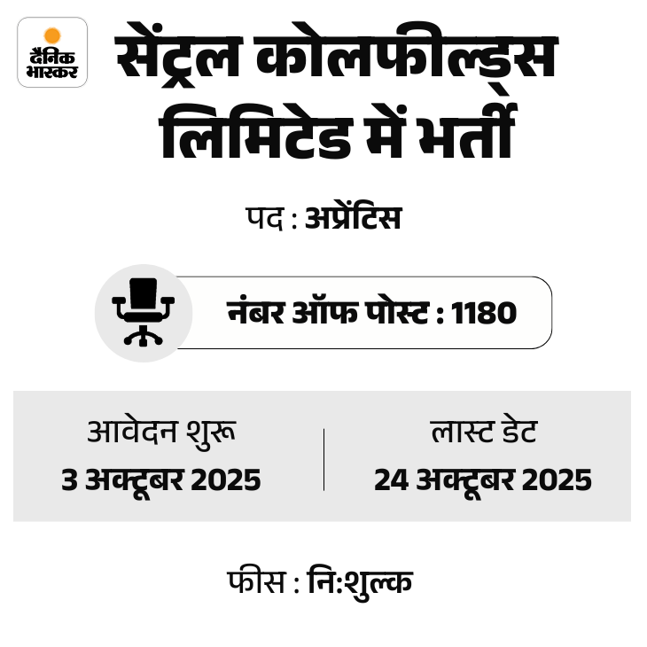 सेंट्रल कोलफील्ड्स लिमिटेड में 1180 पदों पर भर्ती निकली है। उम्मीदवार ऑफिशियल वेबसाइट centralcoalfields.in पर जाकर अप्लाई कर सकते हैं। ट्रेनिंग पीरियड पद के अनुसार 1 से 2 साल का रहेगा।