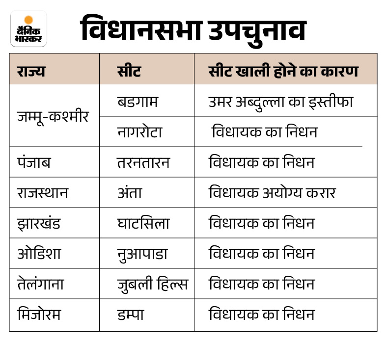 - जम्मू-कश्मीर में बडगाम और नागरोटा, राजस्थान में अंता, झारखंड में घाटसिला (ST), तेलंगाना में जुबली हिल्स, पंजाब में तरनतारन, मिजोरम में डम्पा और ओडिशा में नुआपाडा विधानसभा सीट पर उपचुनाव होना है।