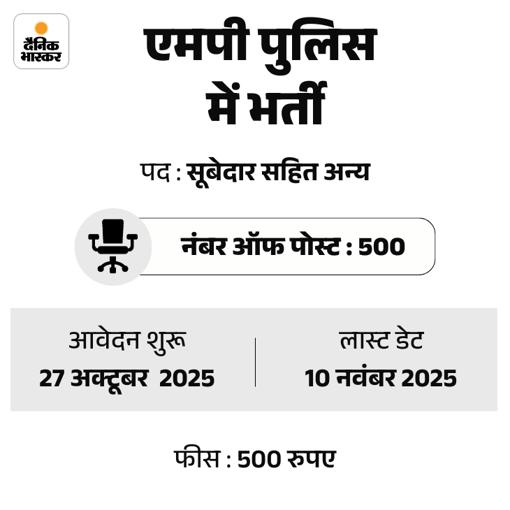 मध्यप्रदेश में सब इंस्पेक्टर और सूबेदार के 500 पदों पर भर्ती निकली है। इस भर्ती के लिए कैंडिडेट्स esb.mp.gov.in के माध्यम से 27 अक्टूबर से आवेदन कर सकेंगे। 15 नवंबर तक आवेदनों में करेक्शन किया जा सकेगा। इन पदों के लिए 9 जनवरी से दो शिफ्ट में परीक्षा शुरू होगी।