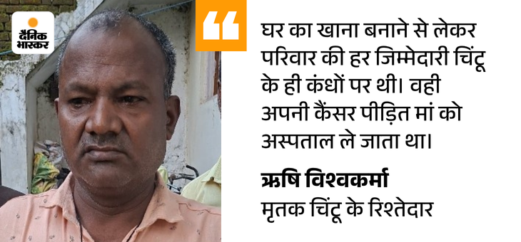 दिव्यांग भाई, मां-पिता के लिए विवाह नहीं किया 38 वर्षीय चिंटू विश्वकर्मा घर में बूढ़े माता-पिता और दिव्यांग भाई को पालने वाला इकलौता सदस्य था। पिता नगर निगम में थे, बीमार होने के कारण नौकरी छूट गई, जैसे-तैसे प्राइवेट जाॅब से घर चल रहा था। चिंटू ने सिर्फ इसलिए विवाह नहीं किया था, कि उसे मां-पिता और दिव्यांग भाई की सेवा करनी है।