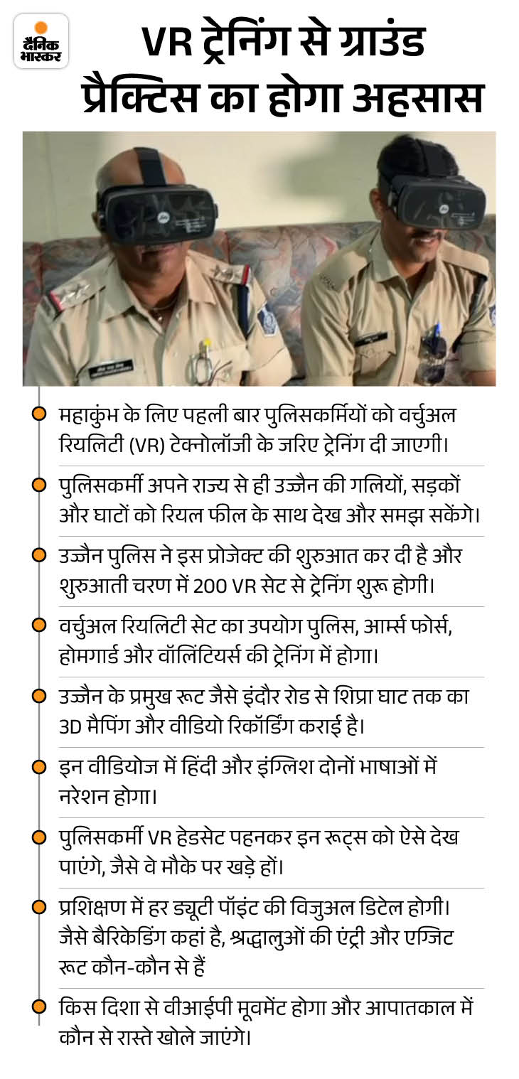 देश में पहली बार पुलिस वर्चुअल रियलिटी (VR) का उपयोग करने जा रही है। यह 2028 महाकुंभ में देखने को मिलेगा। उज्जैन पुलिस सबसे पहले देश भर से कुंभ ड्यूटी के लिए आने वाले 54 हजार पुलिसकर्मियों के साथ शुरुआत करने जा रही है।