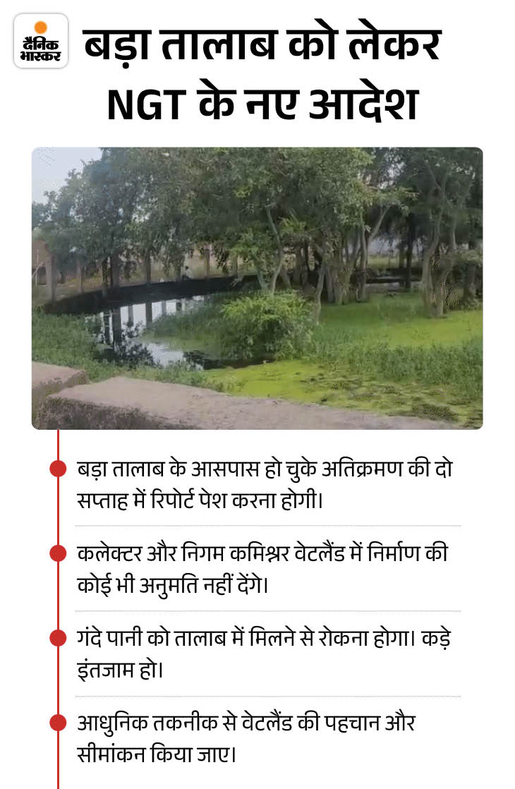 अतिक्रमण और अवैध निर्माण का मुद्दा अभी क्यों उठा? बड़ा तालाब के अतिक्रमण पर हाल ही में एनजीटी फिर सख्त हुआ। इसके बाद बुधवार से सर्वे शुरू किया गया। याचिका पर्यावरणविद् राशिद नूर ने लगाई थी। इस पर एनजीटी ने स्पष्ट किया कि वेटलैंड्स (संरक्षण और प्रबंधन) नियम, 2017 का नियम-4 अब पूरे मध्यप्रदेश के सभी जलाशयों पर लागू होगा।