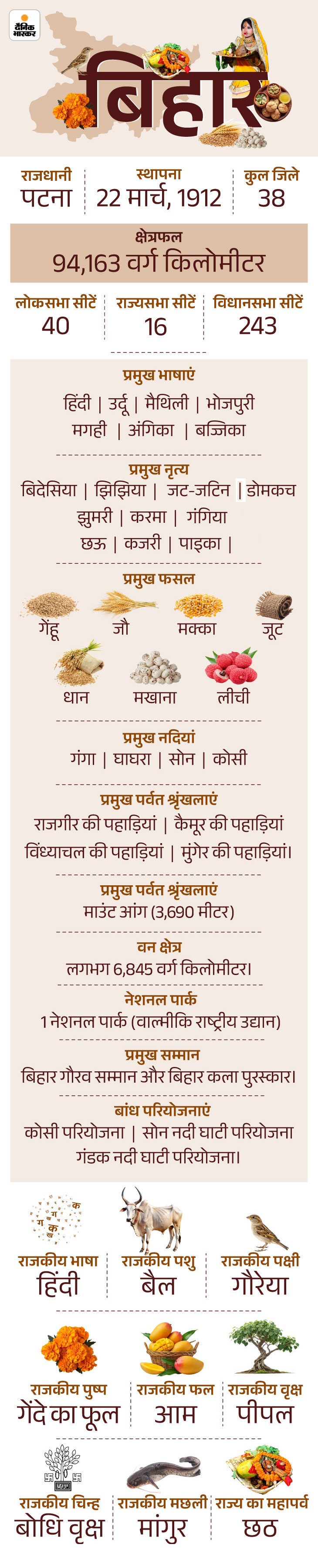 बिहार भारत का 12वां राज्य है। बिहार की स्थापना 22 मार्च, 1912 को हुई थी। हर साल बिहार दिवस 22 मार्च को मनाया जाता है। साल 2025 में बिहार की स्थापना के 113 वर्ष पूरे हो गए।