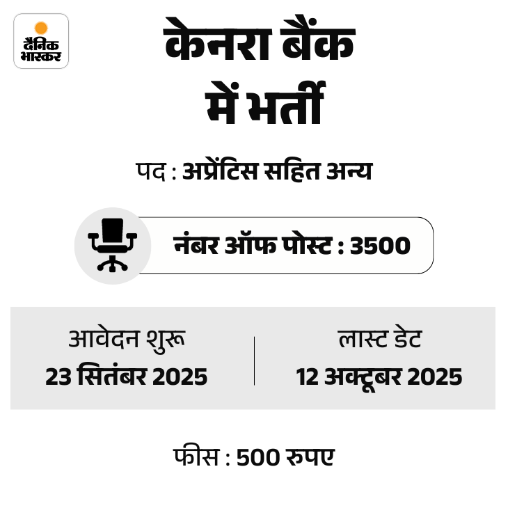 - Canara Bank Recruitment For 3500 Apprentice Posts; Last Date Of Application Is 12th October, Graduates Should Apply Immediately