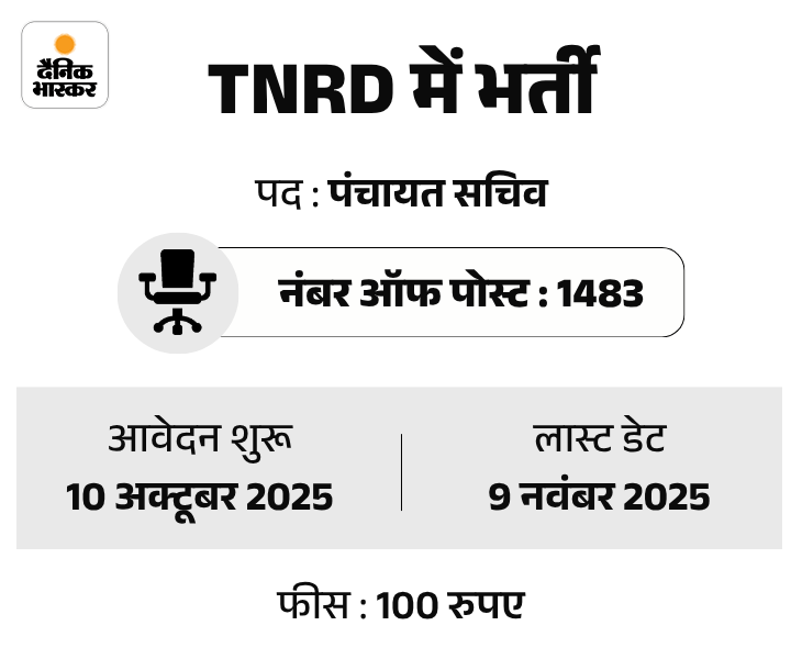 तमिलनाडु रूरल डेवलपमेंट एंड पंचायत राज विभाग में 1400 से ज्यादा पदों पर भर्ती निकली है। उम्मीदवार ऑफिशियल वेबसाइट tnrd.tn.gov.in पर जाकर आवेदन कर सकते हैं।