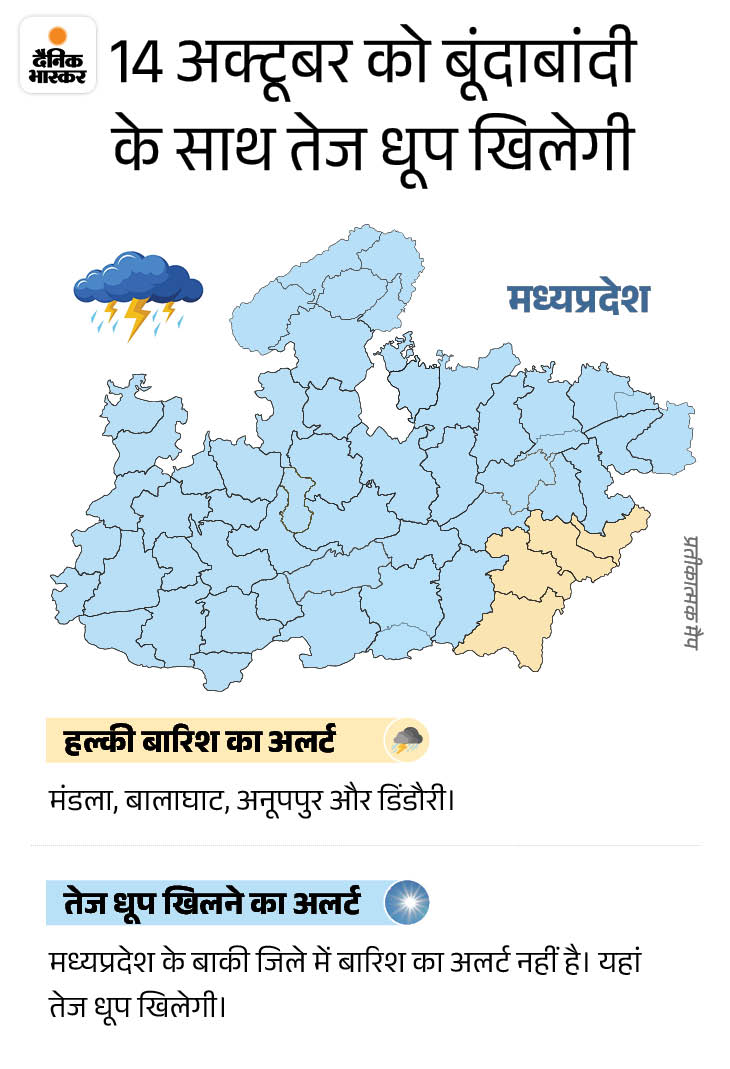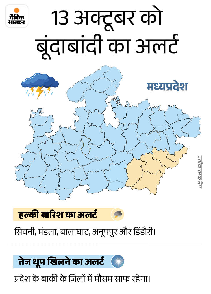 मध्यप्रदेश के पूर्वी हिस्से में अगले 4 दिन हल्की बारिश का अलर्ट है। सिवनी, मंडला, बालाघाट, अनूपपुर और डिंडौरी में पानी गिर सकता है। वहीं, भोपाल, इंदौर, उज्जैन, नर्मदापुरम और ग्वालियर संभाग के शहरों में रातें ठंडी रहेंगी। इससे पहले शनिवार को भी पूर्वी