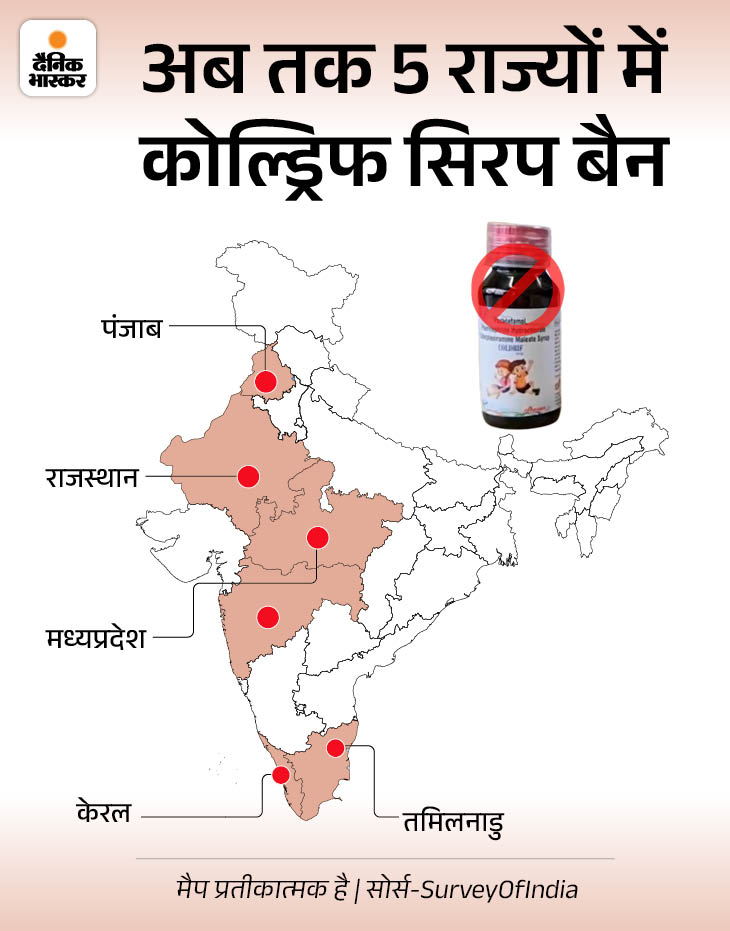 राजस्थान की सरकारी सप्लाई में भी इनपर रोक यही फार्मूले वाली सिरप राजस्थान की सरकारी सप्लाई में भी पाई गई थी, जहां इसे पीने से एक बच्चे की मौत हुई और कुछ डॉक्टर बीमार पड़े। इसके बाद एहतियात के तौर पर प्रदेश में भी इनकी सप्लाई रोकी गई है। अधिकारियों के अनुसार, चार सिरप के सैंपल जांच के लिए भेजे गए हैं। रिपोर्ट आने तक वितरण स्थगित रहेगा। तीन जांचें अब तक ठीक मिली हैं।