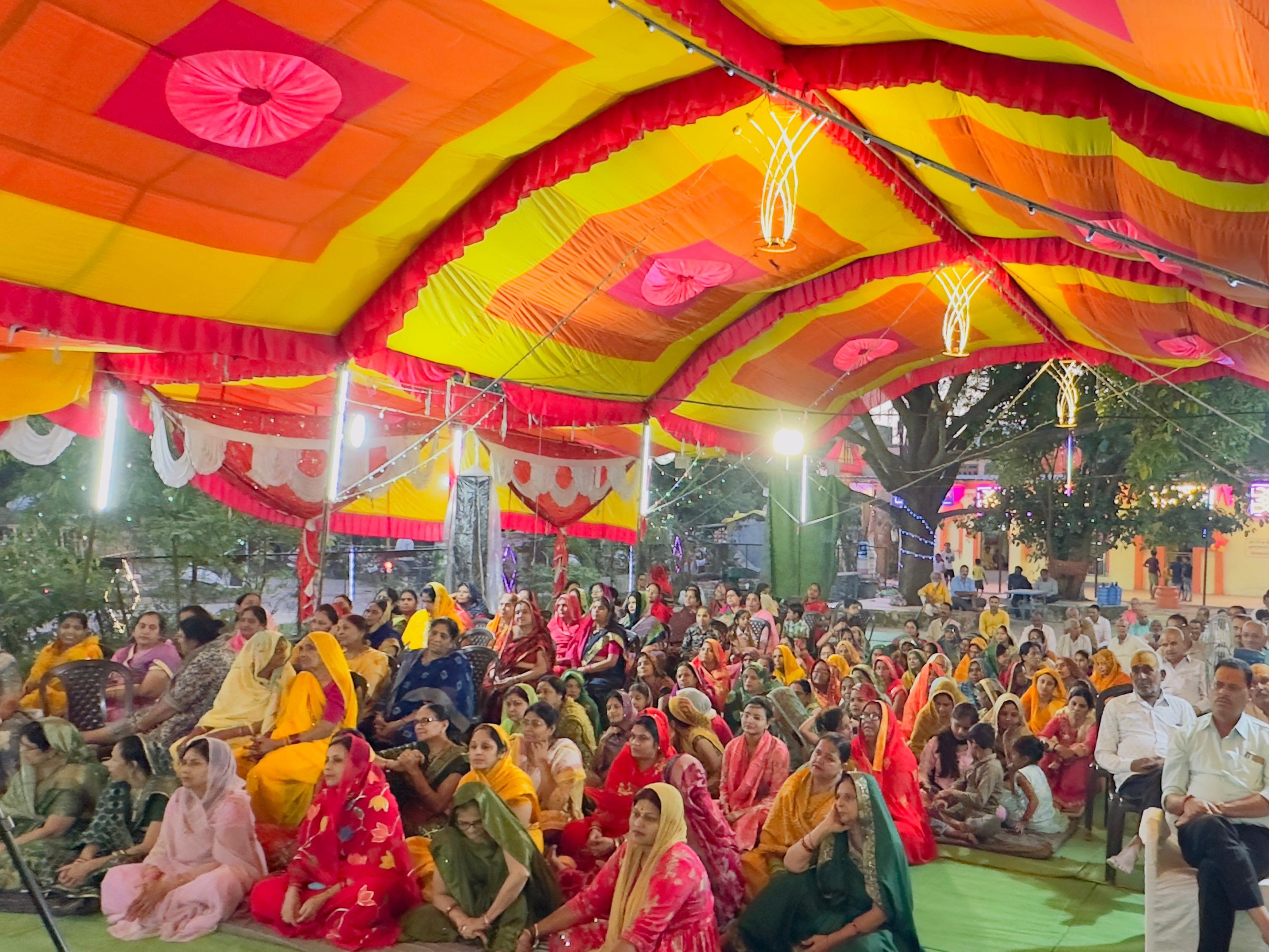 कथा के दौरान धार्मिक भजनों का भी गायन हुआ। भगवान श्रीकृष्ण के विवाह प्रसंग का वर्णन करते हुए बताया गया कि उनका पहला विवाह विदर्भ देश के राजा की पुत्री रुक्मिणी के साथ संपन्न हुआ था।