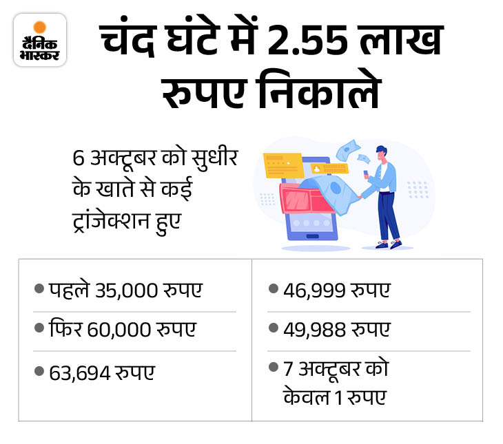 6 अक्टूबर को सुधीर को कई मैसेज आए, जिससे उन्हें पता चला कि खाते से लाखों रुपए निकाले जा चुके हैं। 7 अक्टूबर को केवल 1 रुपए निकाले गए। उन्होंने लगातार लार्ड गंज थाना और बैंक का चक्कर लगाया, पर समाधान नहीं मिला। 11 अक्टूबर को उन्होंने साइबर पुलिस में शिकायत दर्ज कराई।
