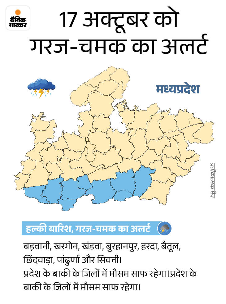 भोपाल, इंदौर और सागर संभाग में रातें ठंडी हो गई है। यहां पारा 17 डिग्री से नीचे है। वहीं, दक्षिणी हिस्से के 9 जिले-खरगोन, खंडवा, बुरहानपुर, हरदा, बैतूल, छिंदवाड़ा, पांढुर्णा, सिवनी और बालाघाट में आज बादल छाने और बूंदाबांदी होने का अनुमान है।