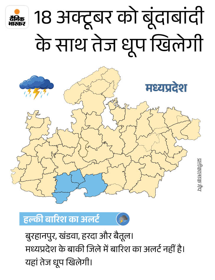 मौसम विभाग के अनुसार, मानसून के लौटने के बाद भी प्रदेश में बूंदाबांदी वाला मौसम है। बुधवार को दक्षिणी हिस्से के कुछ जिलों में मौसम का मिजाज बदला हुआ रहा। दिन में बादल छाने की वजह से टेम्प्रेचर 29 डिग्री तक पहुंच गया। कुछ जगह बूंदाबांदी भी हो गई। हालांकि, यह रिकॉर्ड नहीं की गई।