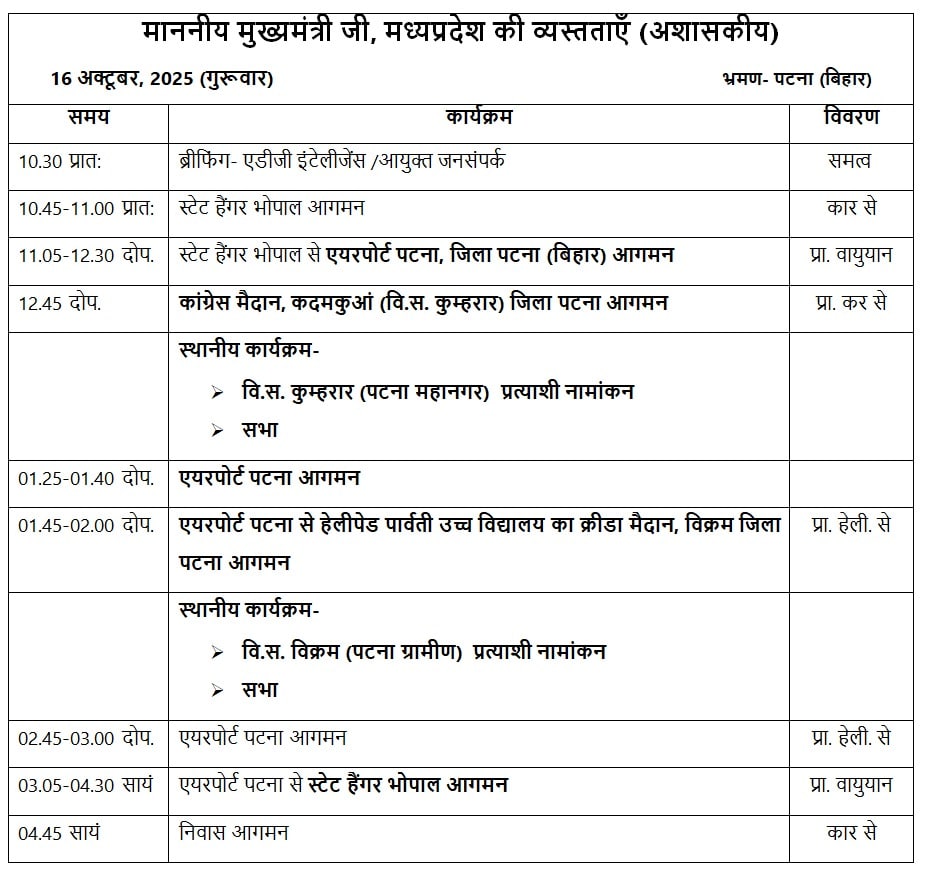 MP LIVE: भोपाल से खबर है कि मुख्यमंत्री डॉ. मोहन यादव 16 अक्टूबर को बिहार विधानसभा चुनाव में प्रचार करने की प्लानिंग कर चुके हैं. वे दो विधानसभा क्षेत्रों कुम्हरार और विक्रम में अपनी ताकत दिखाएंगे.