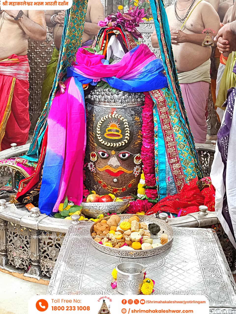 फिर ज्योतिर्लिंग को कपड़े से ढांपकर भस्म अर्पित की गई। इसके साथ ही ड्राय फ्रूट्स और आभूषण अर्पित किए गए। भस्म अर्पण के पश्चात भगवान को शेषनाग का रजत मुकुट, रजत की मुण्डमाला और रुद्राक्ष की माला पहनाई गई। अंत में भगवान महाकाल को सुगंधित पुष्पों और फूलों की माला अर्पित की गई।