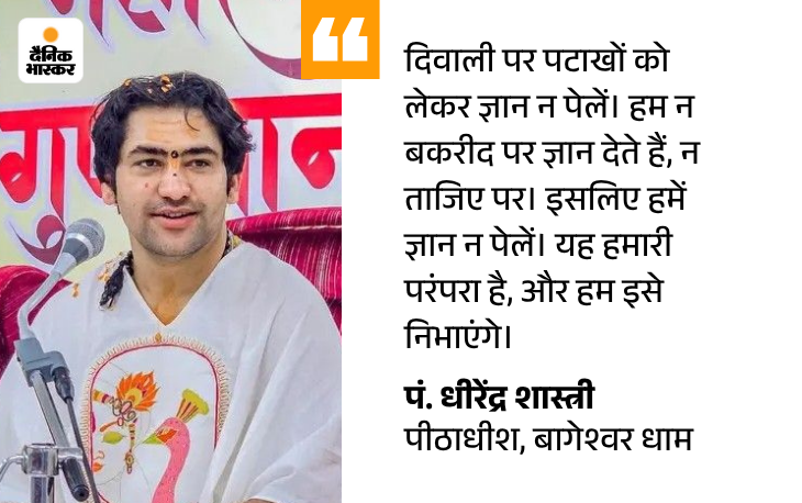 मुंबई में कहा था- पटाखे फोड़ेंगे, यह हमारी परंपरा दरअसल, 8 दिन पहले शनिवार को धीरेंद्र शास्त्री मुंबई में सिद्धि विनायक गणेश मंदिर दर्शन करने पहुंचे थे। यहां मीडिया से बात करते हुए किसी ने उनसे दिवाली पर पटाखों से प्रदूषण होने और बॉलीवुड अभिनेताओं द्वारा पटाखे न फोड़ने की अपील को लेकर सवाल किया। इसे लेकर धीरेंद्र शास्त्री ने ज्ञान न देने की बात कही थी।
