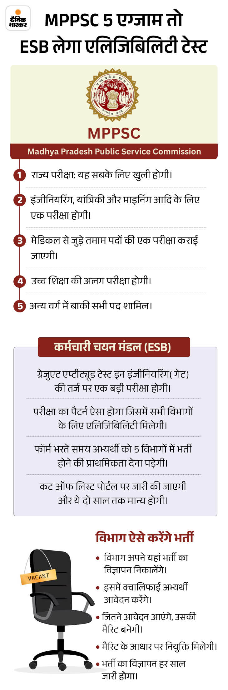 एक कैलेंडर ईयर में एमपीपीएससी सिर्फ 5 और कर्मचारी चयन मंडल (ईएसबी) सिर्फ एक बड़ी परीक्षा कराएगा। शासन स्तर पर ड्राफ्ट लगभग तैयार हो गया है। दिवाली के बाद 23-24 अक्टूबर को मुख्य सचिव स्तर की वरिष्ठ सचिव समिति के सामने इसका प्रेजेंटेशन हो सकता है। फिर ड्राफ्ट को अंतिम रूप दिया जाएगा।