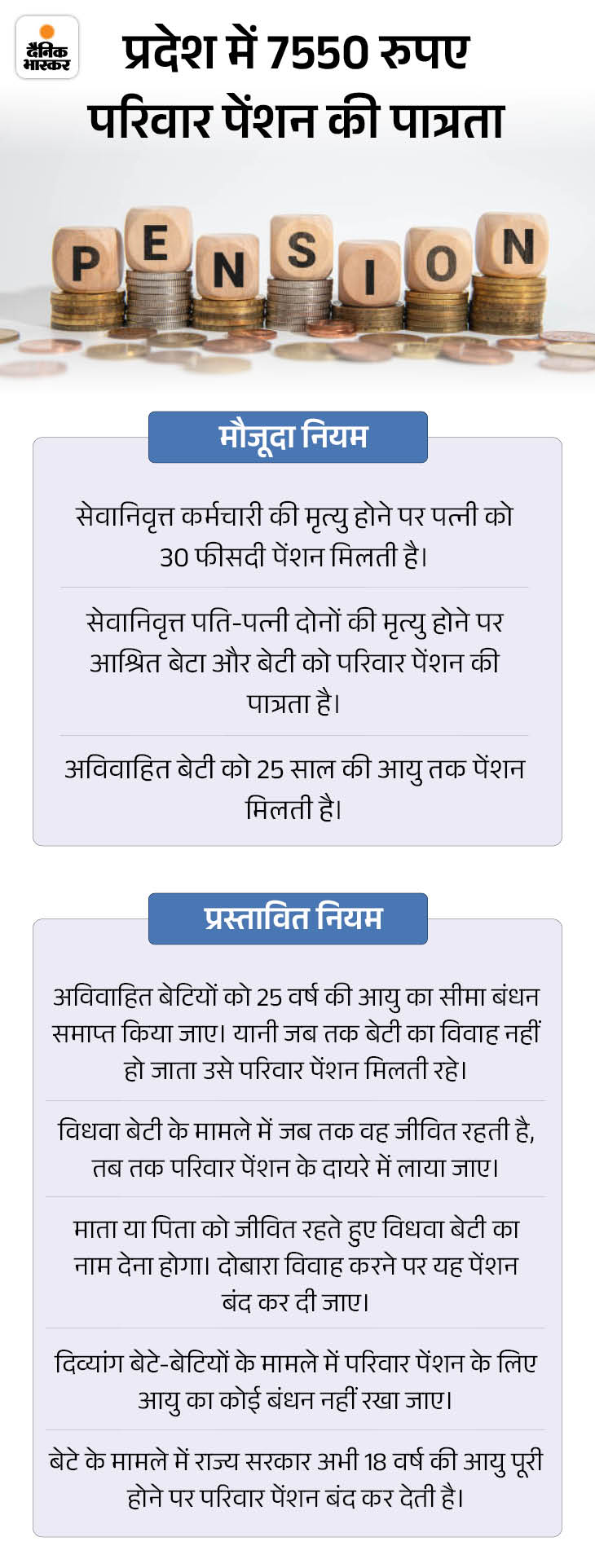 3. केंद्र के समान पेंशन नियम, बेटियों को मिलेगा फायदा मध्य प्रदेश सरकार पेंशन नियमों को केंद्र सरकार के नियमों के मुताबिक बना रही है। नए नियम के तहत, 25 साल से ज्यादा उम्र की अविवाहित, विधवा या परित्यक्ता बेटी भी परिवार पेंशन की पात्र होगी। वर्तमान में यह फायदा केवल 25 वर्ष तक की अविवाहित बेटी को ही मिलता है। यह प्रस्ताव केंद्र सरकार द्वारा 2011 में लागू की गई व्यवस्था पर आधारित है।