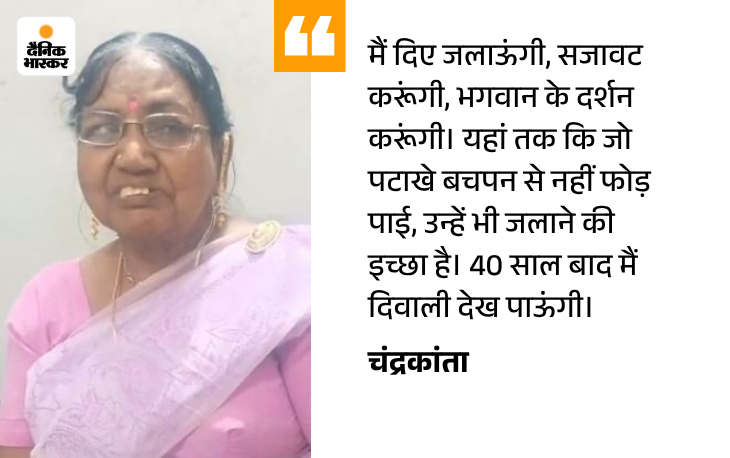 कहानी1: बचपन और जवानी अंधेरे में डूबी.. अब रोशन सवेरा ‘मैंने पिछले 40 साल से दिवाली के मौके पर अंधेरा ही महसूस किया है। मेरा बचपन, मेरी जवानी… सब कुछ इस अंधेरे ने छीन ली थी। यह कहते हुए चंद्रकांता की आवाज में 40 साल का दर्द साफ झलकता है। जब 12 साल की उम्र में उनकी आंखों की रोशनी गई, तो मानो दुनिया ही थम गई। आंखों से लगातार बहते आंसू और फिर अचानक छाई सफेद परत, यह उनके जीवन का सबसे भयानक मोड़ था।