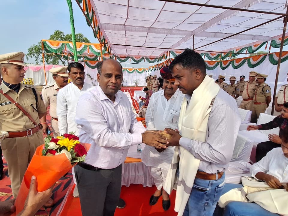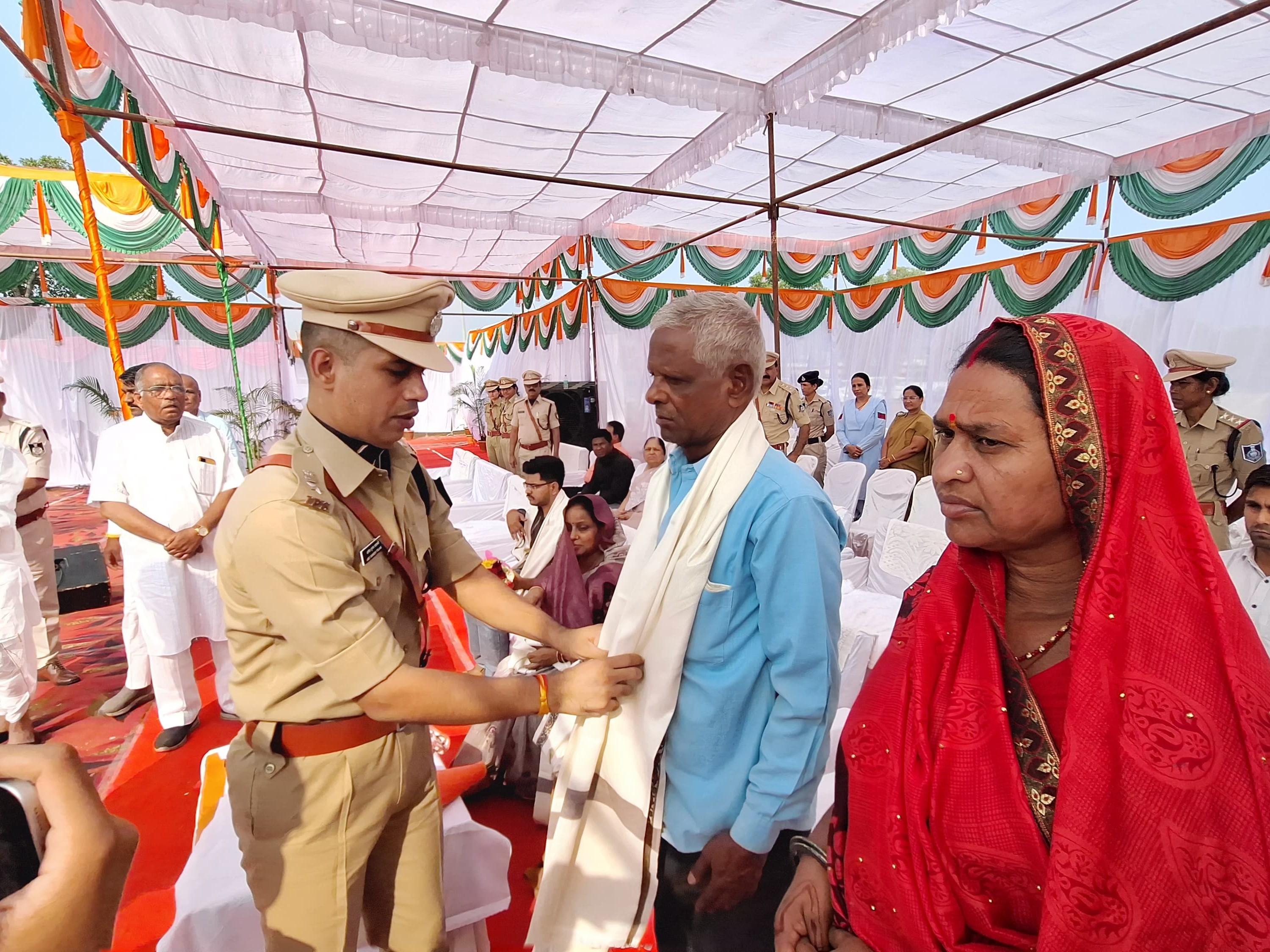 समारोह में शहीद पुलिसकर्मियों के परिजनों को सम्मानित किया गया। उन्हें शाल और श्रीफल भेंट किए गए। इस दौरान कई परिजन मौजूद थे, और पुलिसकर्मियों ने शहीदों के सम्मान में सिर झुकाया।