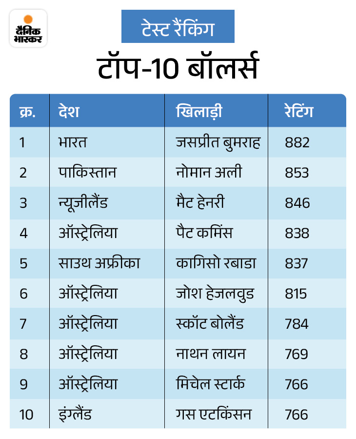 पाकिस्तान के स्पिनर नोमान अली टेस्ट गेंदबाजों की रैंकिंग में भारत के जसप्रीत बुमराह को पीछे छोड़ सकते हैं। इतना ही नहीं, भारतीय कप्तान शुभमन गिल की नंबर-1 पोजिशन भी खतरे में हैं। ICC ने बुधवार अपनी ताजा रैंकिंग जारी की।