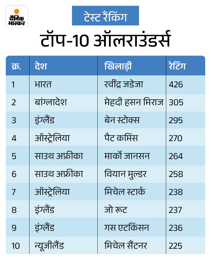 टेस्ट के ऑलराउंडर्स की रैंकिंग में ज्यादा बदलाव नहीं हुआ है। भारत के रवींद्र जडेजा नंबर-1 पर कायम हैं। उनके 426 रेटिंग पॉइंट्स हैं। इसके अलावा, ऑस्ट्रेलिया के पैट कमिंस (270 अंक) चौथे और मार्को यानसन (264 अंक) 5वें नंबर पर आ गए हैं। वॉशिंगटन सुंदर 12वें स्थान पर आ गए हैं।