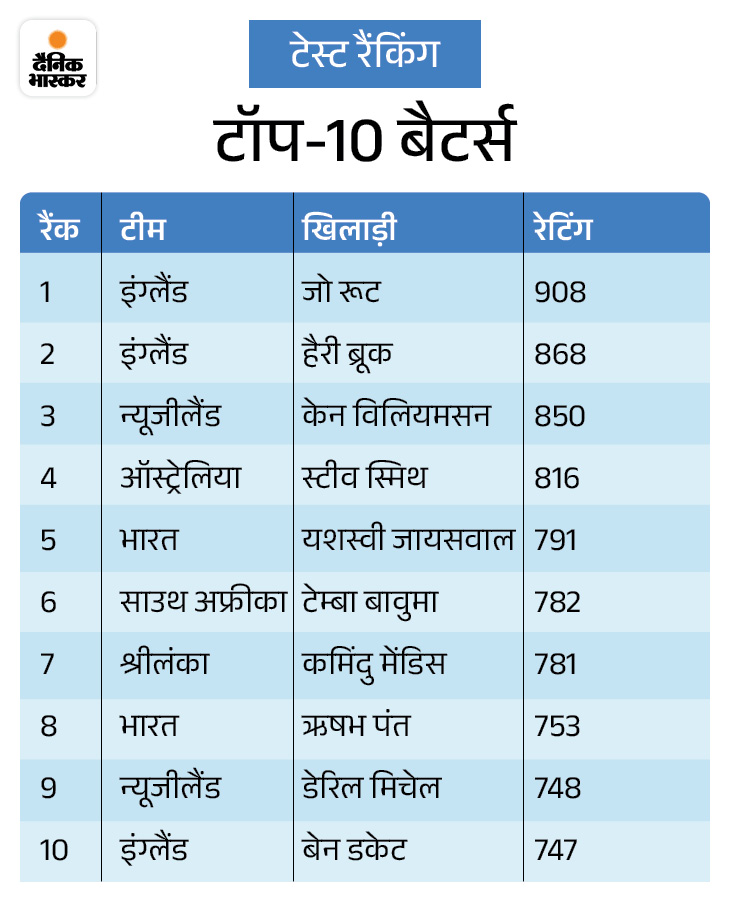 टेस्ट बैटर्स की रैंकिंग में गिल ने सऊद शकील को पीछे छोड़ा टेस्ट बैटर्स की रैंकिंग में भारतीय कप्तान शुभमन गिल ने पाकिस्तान के सऊद शकील को पीछे छोड़ दिया है। गिल 733 रेटिंग पॉइंट्स के साथ 12वें स्थान पर हैं, जबकि सऊद शकील 727 अंक के साथ 13वें स्थान पर हैं। इस लिस्ट में मोहम्मद रिजवान (684 अंक) को 4 और बाबर आजम (654 अंक) को 2 अंक का फायदा हुआ है। इंग्लैंड के जो रूट (908 अंक) टॉप पर कायम हैं।