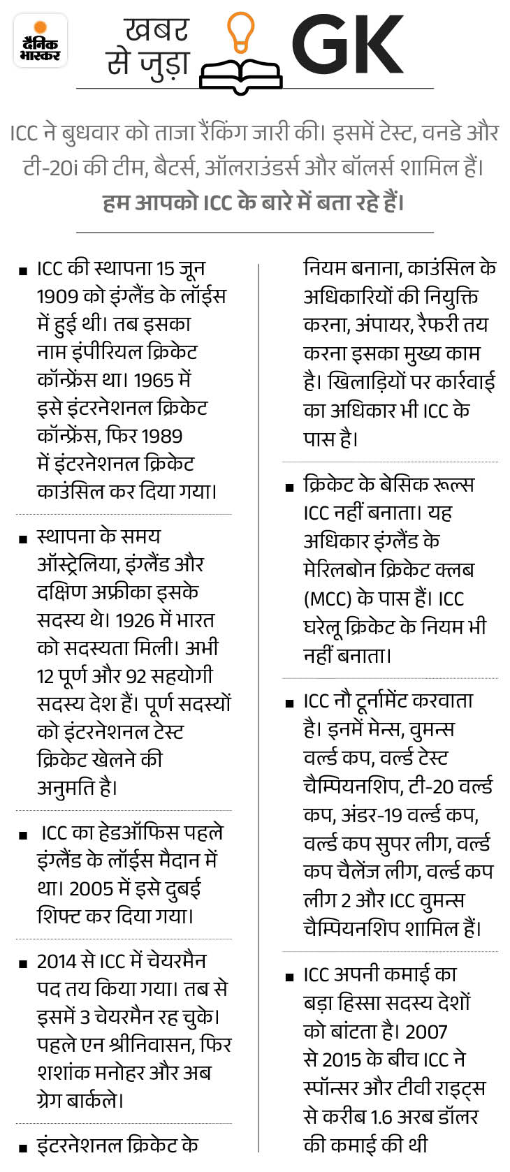 रबाडा को 3 स्थान का नुकसान, अफरीदी को फायदा हुआ टेस्ट गेंदबाजों की रैंकिंग में साउथ अफ्रीका के कगिसो रबाडा और ऑस्ट्रेलिया के जोश हेजलवुड को नुकसान हुआ है। रबाडा तीन स्थान के नुकसान के साथ 5वें नंबर पर आ गए हैं। उनके 837 रेटिंग पॉइंट्स हैं। जबकि ऑस्ट्रेलिया के जोश हेजलवुड (815 अंक) को एक अंक का नुकसान हुआ है। भारतीय गेंदबाजों की रैंकिंग में बदलाव नहीं हुआ है। पाकिस्तान के शाहीन अफरीदी (661 अंक) तीन स्थान के फायदे के साथ 19वें नंबर पर आ गए हैं।