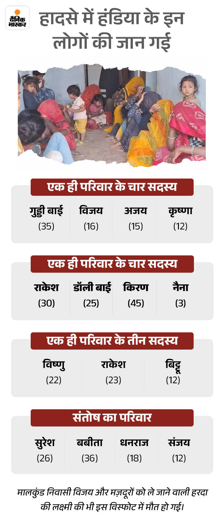 हरदा का धमाका और छिना रोजगार हरदा जिले के हंडिया कस्बे के बाहरी इलाके में रहने वाले ये 6 बंजारा परिवार पीढ़ियों से पटाखे बनाने का काम करते आए हैं। यही उनका हुनर था और यही उनकी रोजी-रोटी का एकमात्र साधन। परिवार के सदस्य हरदा के बैरागढ़ स्थित पटाखा फैक्ट्री में काम करते थे।