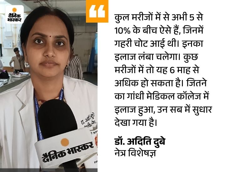 धीरे-धीरे रोशनी लौट रहीं, 10% में 6 माह में होगी स्थिति साफ गांधी मेडिकल कॉलेज की नेत्र विशेषज्ञ डॉ. अदिति दुबे ने कहा कि उन्होंने इस गन से प्रभावित हुए 37 मरीजों का इलाज अब तक किया है। इसमें ज्यादातर की रोशनी लौट आई है, लेकिन जो महीन कण आंखों के अंदर हैं वो जब कॉर्निया साफ होती तब नजर आएंगे। उनका कोई साइड इफेक्ट होगा या नहीं यह कहना मुश्किल है।