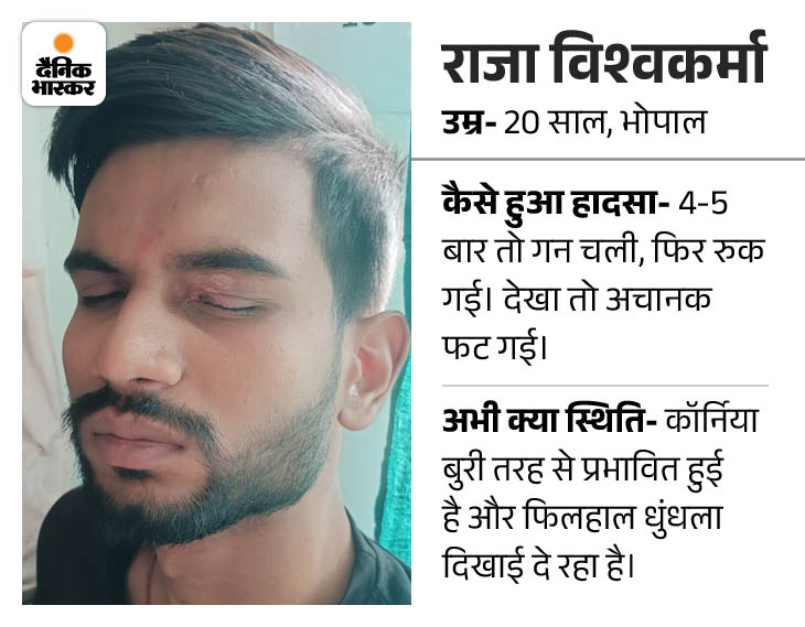 जब झांककर देखा कि क्यों नहीं चल रही, तभी अचानक फटी और आग की चिंगारी आंख में जा लगी। राजा की लेफ्ट आई में गंभीर चोट आई। फिलहाल वे विदिशा मेडिकल कॉलेज में भर्ती हैं, कॉर्निया बुरी तरह से प्रभावित हुई है और फिलहाल धुंधला दिखाई दे रहा है।