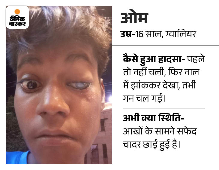 ओम की आंख में कार्बाइड के टुकड़े सीधे जाकर लगे। कॉर्निया पूरी तरह सफेद हो गया है। मां ने बहुत रोका था, कहा था बेटा ये मत चलाना लेकिन मैंने बात नहीं मानी। अब बहुत पछतावा हो रहा है। सब कुछ धुंधला दिखता है, जैसे किसी ने आंखों पर सफेद परदा डाल दिया हो।