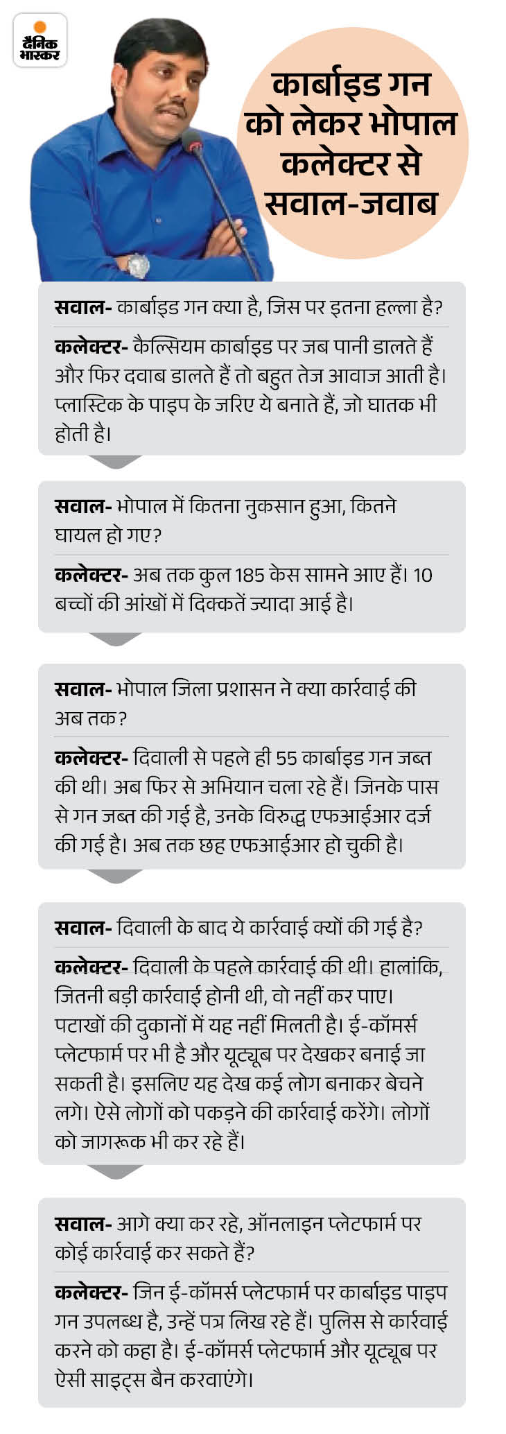 भोपाल प्रशासन सख्ती करेगा इसे लेकर अब भोपाल प्रशासन सख्ती करने जा रहा है। कलेक्टर कौशलेंद्र विक्रम सिंह ने कहा कि ई-कॉमर्स पर भी कार्बाइड गन बिक रही है। उन्हें बंद करवाने के लिए प्रयास शुरू किए हैं। वेंडर्स को लेटर लिख रहे हैं। दूसरी ओर, अस्पतालों में भर्ती मरीजों पर नजर रखी जा रही है।