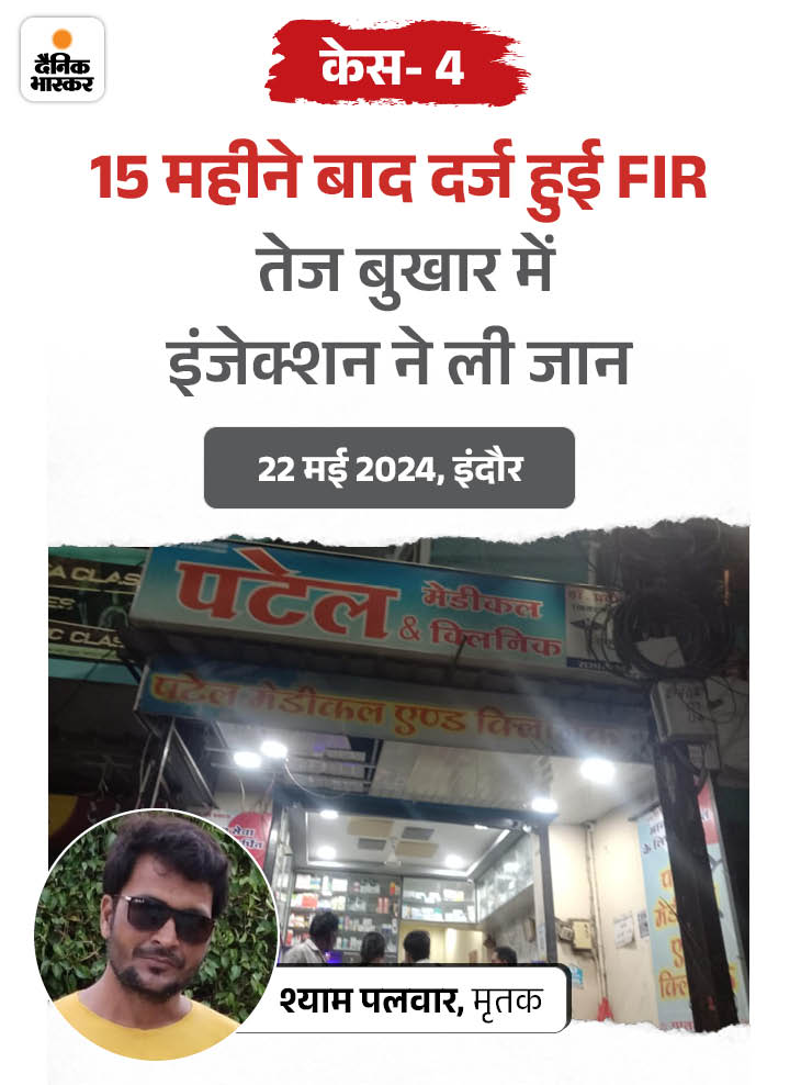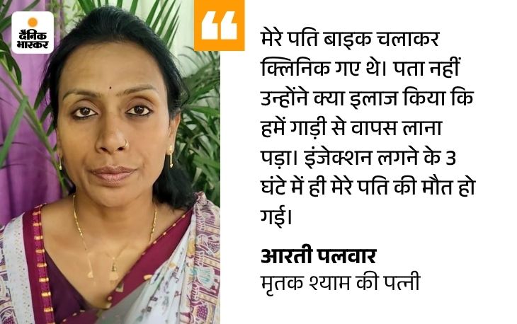 हवा बंगला निवासी श्याम पलवार को तेज बुखार आने पर उनकी पत्नी आरती उन्हें पटेल क्लिनिक ले गईं। वहां इलेक्ट्रोहोम्योपैथी डिग्रीधारी डॉ. प्रदीप पटेल ने उन्हें कई इंजेक्शन लगाए, जिसके 3 घंटे के भीतर ही श्याम की मौत हो गई। परिवार की शिकायत और 15 महीने की लंबी जांच के बाद 21 अगस्त 2025 को डॉक्टर के खिलाफ एफआईआर दर्ज हुई।