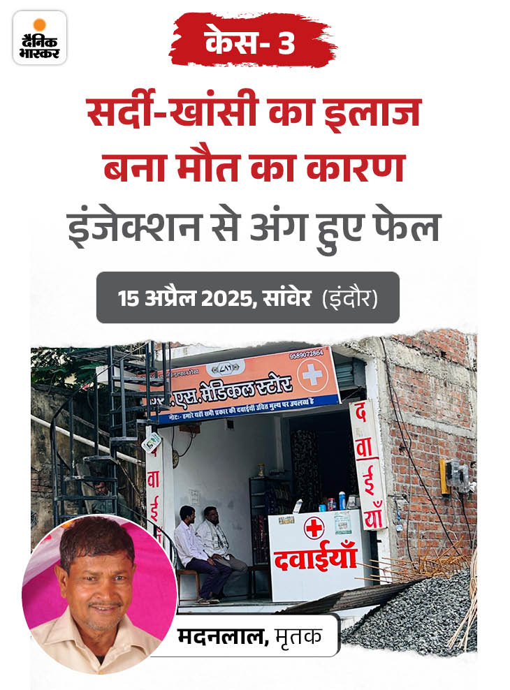 58 वर्षीय मदनलाल को मामूली सर्दी-खांसी थी। उनका बेटा उन्हें मोहल्ले के एसएस मेडिकल स्टोर पर ले गया, जिसे डॉ. मोहम्मद इरफान चलाता था। इलेक्ट्रोहोम्योपैथी की डिग्री रखने वाले इरफान ने मदनलाल को डायनापार और डाइक्लो जैसे एलोपैथिक इंजेक्शन लगा दिए। इसके तुरंत बाद मदनलाल की हालत बिगड़ गई और किडनी-लिवर समेत कई अंगों के फेल हो जाने से उनकी मौत हो गई। पोस्टमॉर्टम रिपोर्ट में मौत का कारण इलाज में लापरवाही बताया गया।