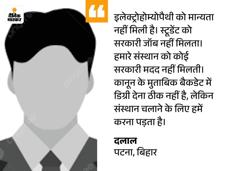 • दलाल: मैं आपको चैलेंज दे सकता हूं कि कोई कानूनी समस्या नहीं होगी। हमारी वेबसाइट जा जाकर देखिए आपको सारी जानकारी मिल जाएगी। हम इंडिया के साथ-साथ नेपाल और भूटान में भी इलेक्ट्रोहोम्योपैथी की डिग्री दे रहे हैं। जहां तक एडमिशन की बात है तो हर साल 500 स्टूडेंट्स का एडमिशन होता है।