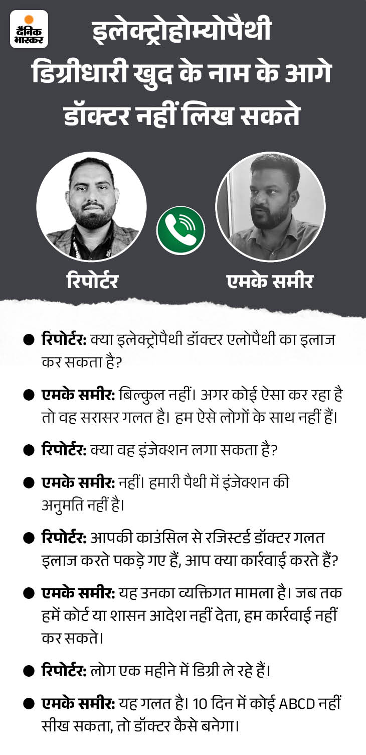 एक संस्था है काउंसिल ऑफ इलेक्ट्रोहोम्योपैथी जहां BEMS की डिग्री लेने वालों का रजिस्ट्रेशन होता है। भास्कर रिपोर्टर इस संस्था के जनरल सेक्रेटरी एमके समीर से मिला। उनसे पूछा कि संस्था कब से काम कर रही है तो समीर ने बताया कि हमारी संस्था 1982 से काम कर रही है। तब से लेकर 2019 तक हमने पूरे मध्य प्रदेश में रजिस्ट्रेशन किए हैं। कोविड के बाद से रजिस्ट्रेशन बंद है।