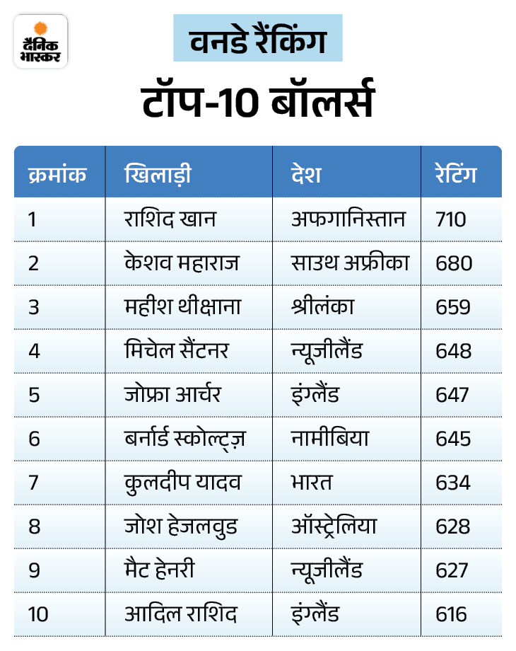 राशिद खान टॉप वनडे बॉलर वनडे बॉलिंग रैंकिंग में जोश हेजलवुड दो स्थान ऊपर चढ़कर आठवें स्थान पर पहुंच गए हैं, लेकिन भारत के कुलदीप यादव छठे से सातवें स्थान पर खिसक गए हैं। स्पिनर एडम जम्पा ने दूसरे भारत-ऑस्ट्रेलिया वनडे में चार विकेट लिए और वह भी दो पायदान ऊपर (अब 12वें स्थान पर) पहुंच गए हैं। वहीं, अफगानिस्तान के ऑलराउंडर राशिद खान बॉलिंग रैकिंग में टॉप पर बने हुए हैं।