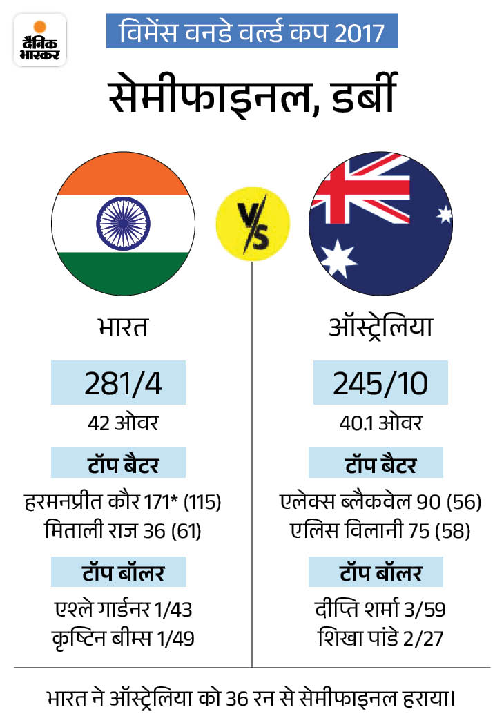 23 जुलाई 2017, लंदन के द लॉर्ड्स स्टेडियम में वनडे वर्ल्ड कप जीतने का सपना देख रही इंडिया विमेंस टीम इंग्लैंड के खिलाफ 9 रन से फाइनल हार गई। तब हरमनप्रीत कौर ने सेमीफाइनल में सेंचुरी और फाइनल में हाफ सेंचुरी बनाई थी। फिर भी टीम खिताब नहीं जीत पाई।